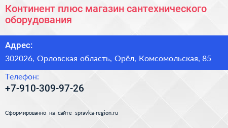 Континент-плюс, магазин сантехнического оборудования по адресу 302026, Орловская область, Орёл, Комсомольская, 85 в дальнейшем Организация, размещена в следующих категориях: