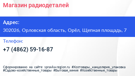Магазин радиодеталей по адресу 302026, Орловская область, Орёл, Щепная площадь, 7 в дальнейшем Организация, размещена в следующих категориях: