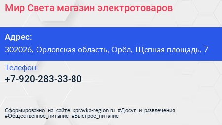 Мир Света, магазин электротоваров по адресу 302026, Орловская область, Орёл, Щепная площадь, 7 в дальнейшем Организация, размещена в следующих категориях: