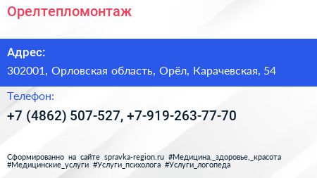 Орелтепломонтаж по адресу 302001, Орловская область, Орёл, Карачевская, 54 в дальнейшем Организация, размещена в следующих категориях: