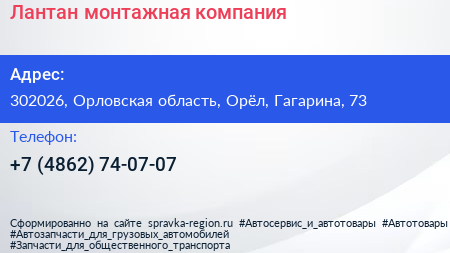 Лантан, монтажная компания по адресу 302026, Орловская область, Орёл, Гагарина, 73 в дальнейшем Организация, размещена в следующих категориях: