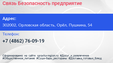 Связь-Безопасность, предприятие по адресу 302002, Орловская область, Орёл, Пушкина, 54 в дальнейшем Организация, размещена в следующих категориях: