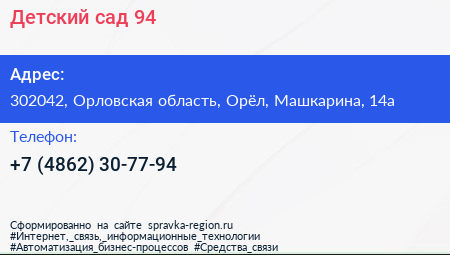 Детский сад №94 по адресу 302042, Орловская область, Орёл, Машкарина, 14а в дальнейшем Организация, размещена в следующих категориях: