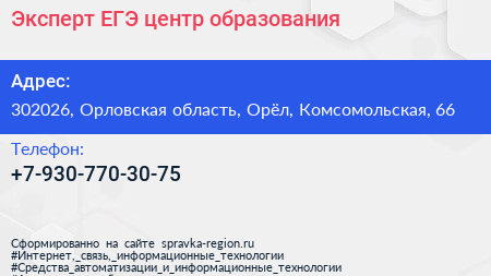 Эксперт-ЕГЭ, центр образования по адресу 302026, Орловская область, Орёл, Комсомольская, 66 в дальнейшем Организация, размещена в следующих категориях: