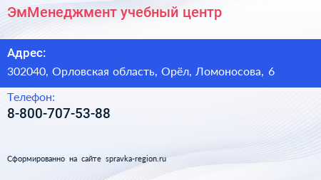 ЭмМенеджмент, учебный центр по адресу 302040, Орловская область, Орёл, Ломоносова, 6 в дальнейшем Организация, размещена в следующих категориях:
