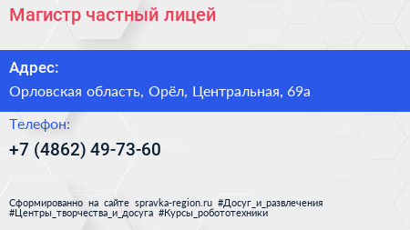 Магистр, частный лицей по адресу Орловская область, Орёл, Центральная, 69а в дальнейшем Организация, размещена в следующих категориях: