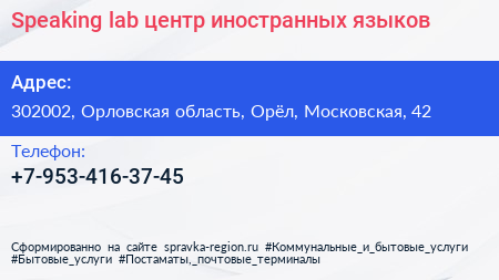 Speaking lab, центр иностранных языков по адресу 302002, Орловская область, Орёл, Московская, 42 в дальнейшем Организация, размещена в следующих категориях: