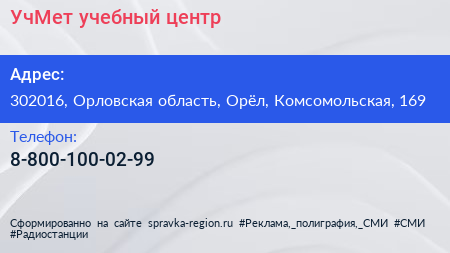 УчМет, учебный центр по адресу 302016, Орловская область, Орёл, Комсомольская, 169 в дальнейшем Организация, размещена в следующих категориях: