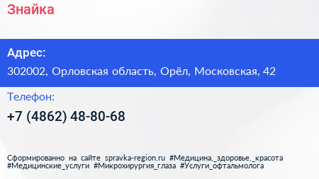Знайка по адресу 302002, Орловская область, Орёл, Московская, 42 в дальнейшем Организация, размещена в следующих категориях: