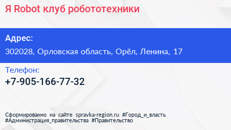 Я+Robot, клуб робототехники по адресу 302028, Орловская область, Орёл, Ленина, 17 в дальнейшем Организация, размещена в следующих категориях: