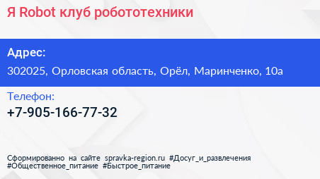 Я+Robot, клуб робототехники по адресу 302025, Орловская область, Орёл, Маринченко, 10а в дальнейшем Организация, размещена в следующих категориях: