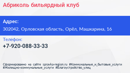 Абриколь, бильярдный клуб по адресу 302042, Орловская область, Орёл, Машкарина, 16 в дальнейшем Организация, размещена в следующих категориях: