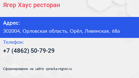 Ягер Хаус, ресторан по адресу 302004, Орловская область, Орёл, Ливенская, 68а в дальнейшем Организация, размещена в следующих категориях: