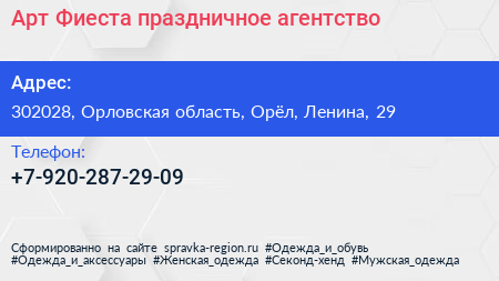 Арт-Фиеста, праздничное агентство по адресу 302028, Орловская область, Орёл, Ленина, 29 в дальнейшем Организация, размещена в следующих категориях: