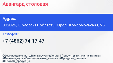 Авангард, столовая по адресу 302026, Орловская область, Орёл, Комсомольская, 95 в дальнейшем Организация, размещена в следующих категориях: