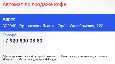 Автомат по продаже кофе по адресу 302040, Орловская область, Орёл, Октябрьская, 120 в дальнейшем Организация, размещена в следующих категориях: