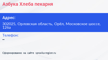 Азбука Хлеба, пекарня по адресу 302025, Орловская область, Орёл, Московское шоссе, 126а в дальнейшем Организация, размещена в следующих категориях: