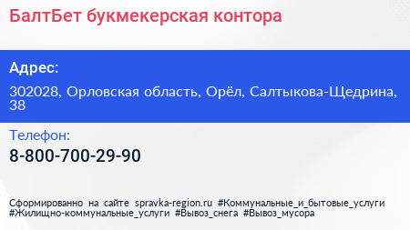 БалтБет, букмекерская контора по адресу 302028, Орловская область, Орёл, Салтыкова-Щедрина, 38 в дальнейшем Организация, размещена в следующих категориях: