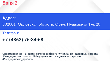 Баня №2 по адресу 302001, Орловская область, Орёл, Пушкарная 1-я, 20 в дальнейшем Организация, размещена в следующих категориях: