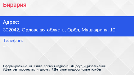 Бирария по адресу 302042, Орловская область, Орёл, Машкарина, 10 в дальнейшем Организация, размещена в следующих категориях: