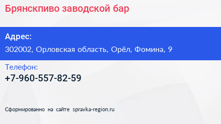Брянскпиво, заводской бар по адресу 302002, Орловская область, Орёл, Фомина, 9 в дальнейшем Организация, размещена в следующих категориях: