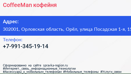 CoffeeMan, кофейня по адресу 302001, Орловская область, Орёл, улица Посадская 1-я, 15 в дальнейшем Организация, размещена в следующих категориях: