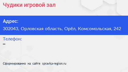 Чудики, игровой зал по адресу 302043, Орловская область, Орёл, Комсомольская, 242 в дальнейшем Организация, размещена в следующих категориях:
