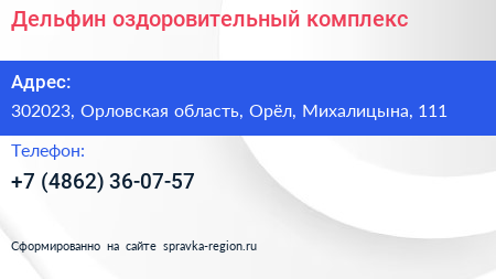 Дельфин, оздоровительный комплекс по адресу 302023, Орловская область, Орёл, Михалицына, 111 в дальнейшем Организация, размещена в следующих категориях: