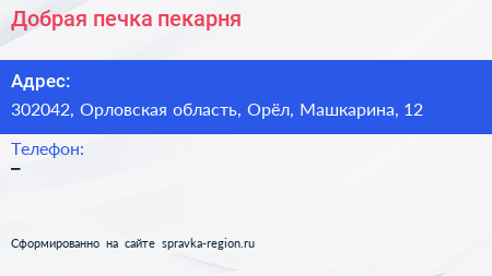 Добрая печка, пекарня по адресу 302042, Орловская область, Орёл, Машкарина, 12 в дальнейшем Организация, размещена в следующих категориях: