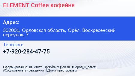 ELEMENT Coffee, кофейня по адресу 302001, Орловская область, Орёл, Воскресенский переулок, 7 в дальнейшем Организация, размещена в следующих категориях:
