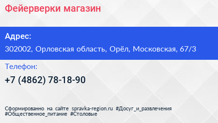 Фейерверки, магазин по адресу 302002, Орловская область, Орёл, Московская, 67/3 в дальнейшем Организация, размещена в следующих категориях:
