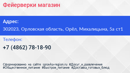 Фейерверки, магазин по адресу 302023, Орловская область, Орёл, Михалицына, 5а ст1 в дальнейшем Организация, размещена в следующих категориях: