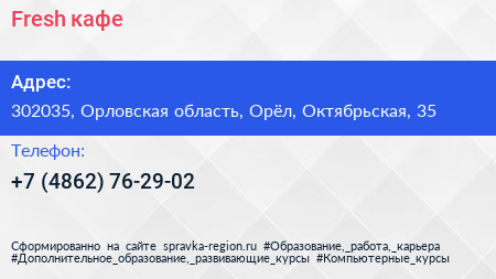 Fresh, кафе по адресу 302035, Орловская область, Орёл, Октябрьская, 35 в дальнейшем Организация, размещена в следующих категориях: