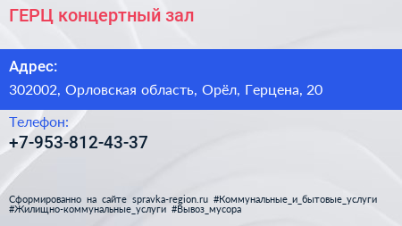 ГЕРЦ, концертный зал по адресу 302002, Орловская область, Орёл, Герцена, 20 в дальнейшем Организация, размещена в следующих категориях: