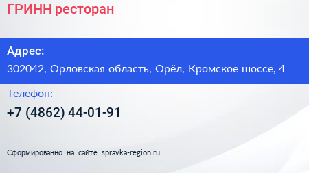 ГРИНН, ресторан по адресу 302042, Орловская область, Орёл, Кромское шоссе, 4 в дальнейшем Организация, размещена в следующих категориях: