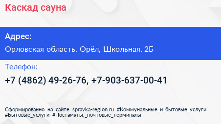 Каскад, сауна по адресу Орловская область, Орёл, Школьная, 2Б в дальнейшем Организация, размещена в следующих категориях: