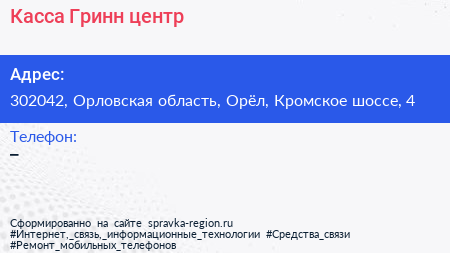 Касса Гринн центр по адресу 302042, Орловская область, Орёл, Кромское шоссе, 4 в дальнейшем Организация, размещена в следующих категориях: