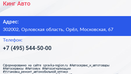 Кинг Авто по адресу 302002, Орловская область, Орёл, Московская, 67 в дальнейшем Организация, размещена в следующих категориях: