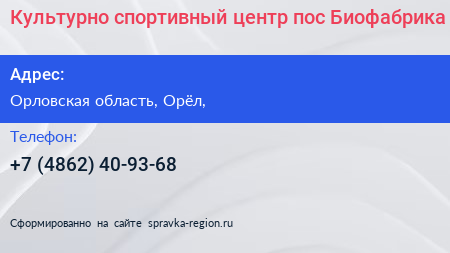 Культурно-спортивный центр пос. Биофабрика по адресу Орловская область, Орёл, в дальнейшем Организация, размещена в следующих категориях: