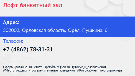 Лофт, банкетный зал по адресу 302002, Орловская область, Орёл, Пушкина, 6 в дальнейшем Организация, размещена в следующих категориях: