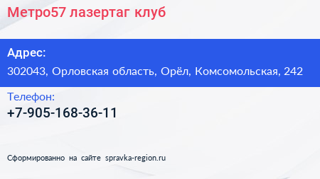 Метро57, лазертаг-клуб по адресу 302043, Орловская область, Орёл, Комсомольская, 242 в дальнейшем Организация, размещена в следующих категориях: