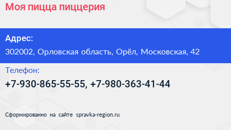 Моя пицца, пиццерия по адресу 302002, Орловская область, Орёл, Московская, 42 в дальнейшем Организация, размещена в следующих категориях: