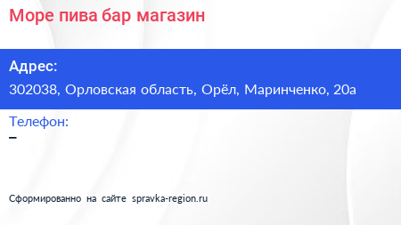 Море пива, бар-магазин по адресу 302038, Орловская область, Орёл, Маринченко, 20а в дальнейшем Организация, размещена в следующих категориях: