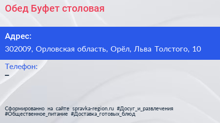 Обед-Буфет, столовая по адресу 302009, Орловская область, Орёл, Льва Толстого, 10 в дальнейшем Организация, размещена в следующих категориях: