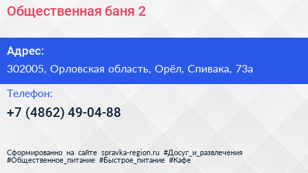 Общественная баня №2 по адресу 302005, Орловская область, Орёл, Спивака, 73а в дальнейшем Организация, размещена в следующих категориях: