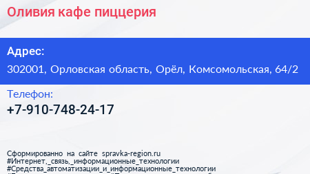 Оливия, кафе-пиццерия по адресу 302001, Орловская область, Орёл, Комсомольская, 64/2 в дальнейшем Организация, размещена в следующих категориях: