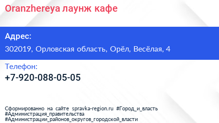Oranzhereya, лаунж-кафе по адресу 302019, Орловская область, Орёл, Весёлая, 4 в дальнейшем Организация, размещена в следующих категориях: