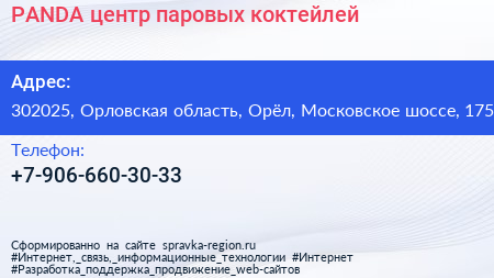 PANDA, центр паровых коктейлей по адресу 302025, Орловская область, Орёл, Московское шоссе, 175 в дальнейшем Организация, размещена в следующих категориях: