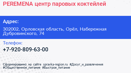 PEREMENA, центр паровых коктейлей по адресу 302002, Орловская область, Орёл, Набережная Дубровинского, 74 в дальнейшем Организация, размещена в следующих категориях: