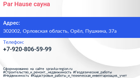 Par Hause, сауна по адресу 302002, Орловская область, Орёл, Пушкина, 37а в дальнейшем Организация, размещена в следующих категориях: